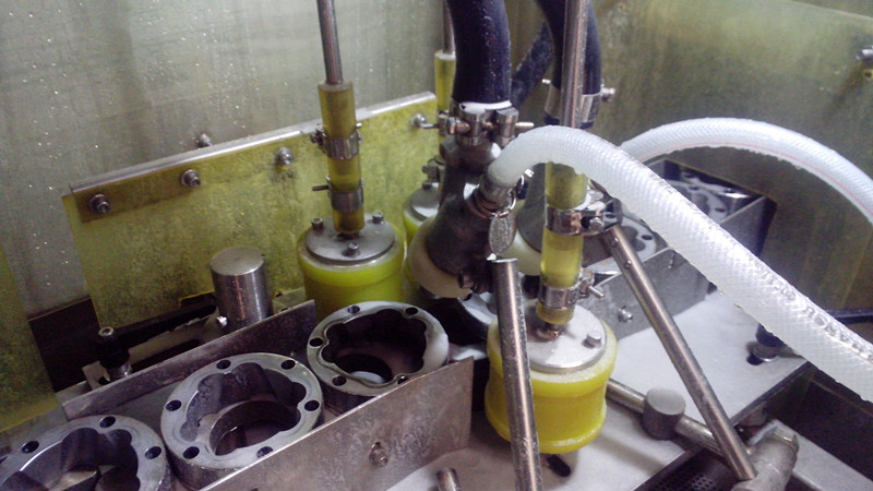 1.2.????? 工件回轉(zhuǎn)由空心輪帶動(dòng),工件上端各有二把噴槍向工件內(nèi)孔及球道斜向噴射,只允許有少量的砂液噴在兩端面上。